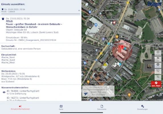 Verhoog uw situationeel bewustzijn met geïntegreerde brandweer- en locatieplattegronden, inclusief nauwkeurige weergave van waterwinningpunten en de mogelijkheid om bereidstellingslocaties te definiëren. EMS-Tablet toont bovendien de voertuigen en uitrusting van andere korpsen in de nabijheid en levert actuele weersinformatie. Navigatie naar de incidentlocatie wordt gestroomlijnd met een 1-klik optie naar externe navigatie-apps, en u kunt zelfs de alarmmonitor bedienen. Het is echter cruciaal te benadrukken dat EMS-Tablet functioneert als een waardevolle, aanvullende tool voor incidentmelding en communicatie, en niet bedoeld is ter vervanging van primaire alarmeringssystemen zoals pagers of sirenes.