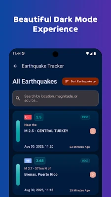 Ervaar het gemak van bijna real-time meldingen, vaak binnen enkele minuten na publicatie, afgestemd op uw persoonlijke voorkeuren voor magnitude en afstand. De heldere, moderne Material 3-interface zorgt voor een snelle, vloeiende en gemakkelijk leesbare ervaring, compleet met zowel lichte als donkere weergavemodi. Verken recente aardbevingen op de interactieve live-kaart, met opties voor satelliet- of terreinlagen, en zoom in op lokale activiteit voor gedetailleerde inzichten. Dankzij de batterijvriendelijke architectuur blijven meldingen betrouwbaar zonder significante invloed op de energiezuinigheid van uw toestel.